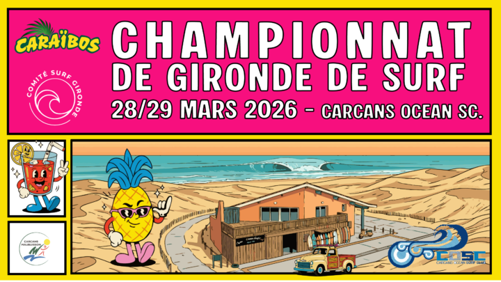 Le Comité Surf Gironde est fier d’annoncer la tenue du Championnat de Gironde Open Caraïbos, qui se déroulera les 28 et 29 mars 2026 sur la plage de Carcans Océan.