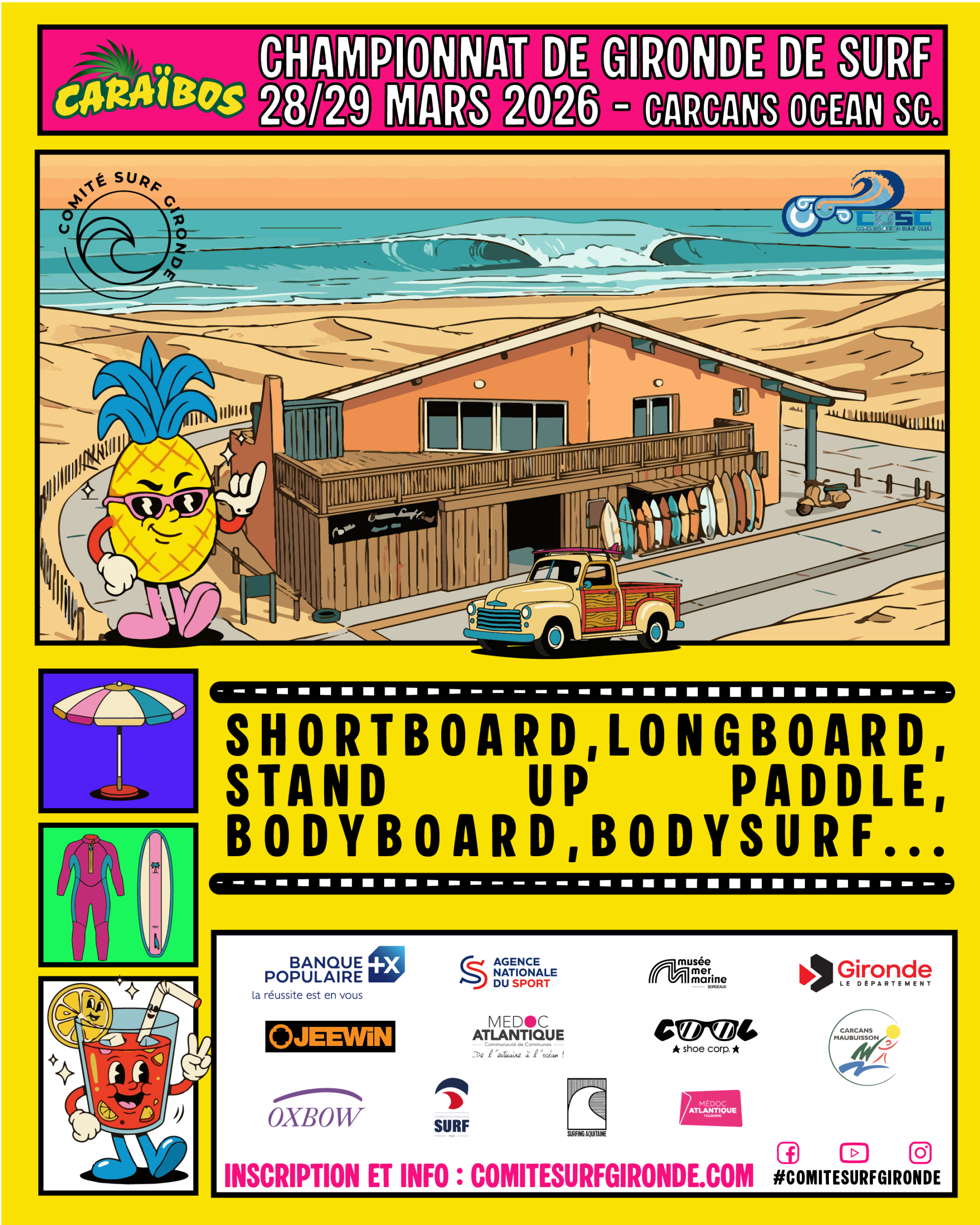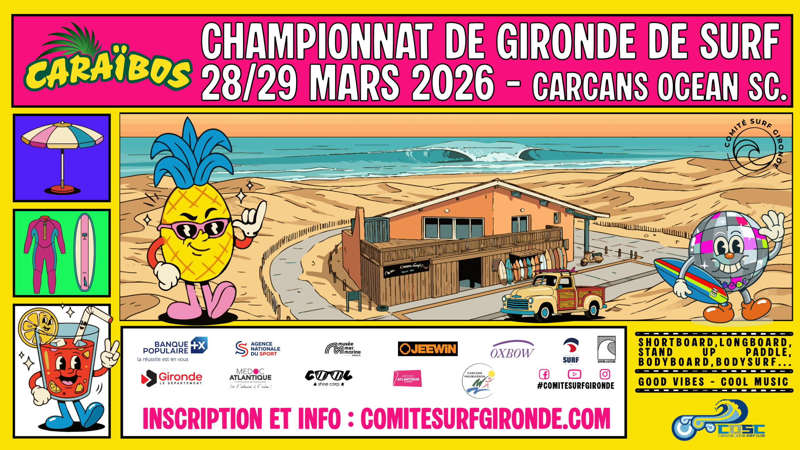 Le Comité Surf Gironde est fier d’annoncer la tenue du Championnat de Gironde Open Caraïbos, qui se déroulera les 28 et 29 mars 2026 sur la plage de Carcans Océan.